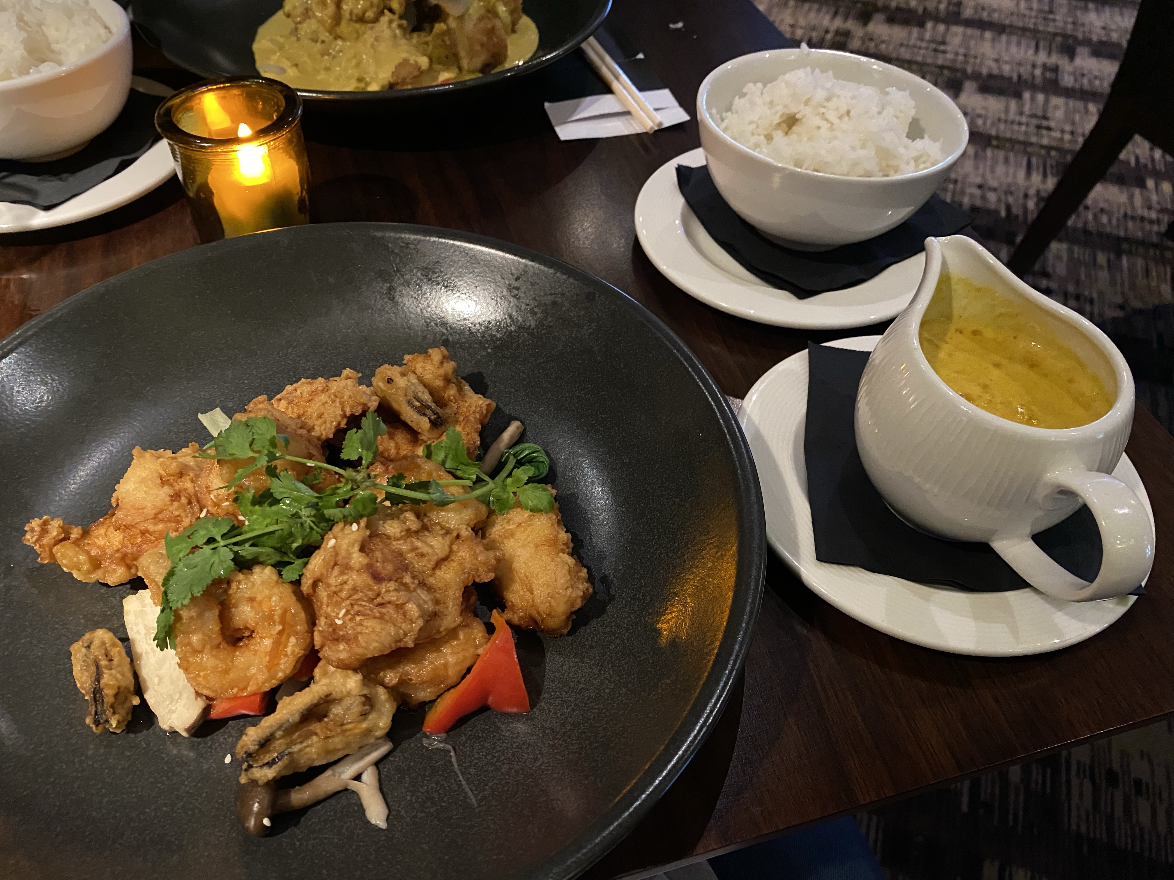 What a fantastic dinner, the Thai restaurant is so authentic, the chef and sous are both from Thailand and truly know their cuisine!! For starters we had dim sum, prawns and veg, followed by Thai Seafood Karee, which is mixed seafood in turmeric based sauce served with jasmine rice. We had a teetotal day so tonic water was on the cards this evening followed by a latte…oat milk only 😜😜. We’re totally stuffed!!!