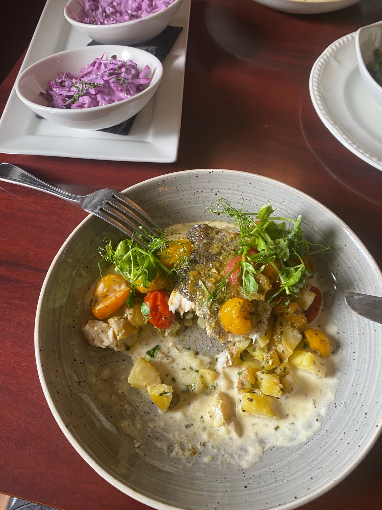 The waitress showed us to a table and gave us each a menu. For starters, scallops to share, for main, fillet of hake with cherry tomatoes and baby potatoes with a creamy sauce. Sides of red cabbage slaw and mixed vegetables. Starter rating was 6 / 10, reason was over cooked scallops, mains rating was 9 / 10, fillet was fresh but the mixed vegetables looked frozen. (Keep your pants on, until you’ve tasted this food, you have to go by what we rate the food 🤣🤣🤣😜😜😜).