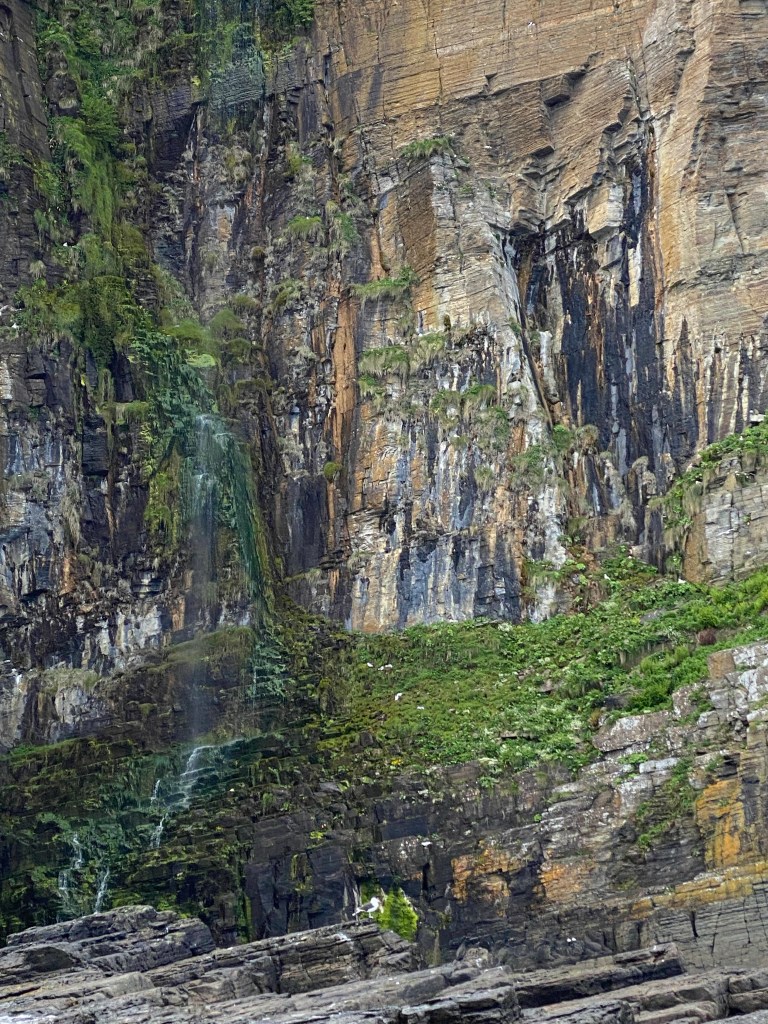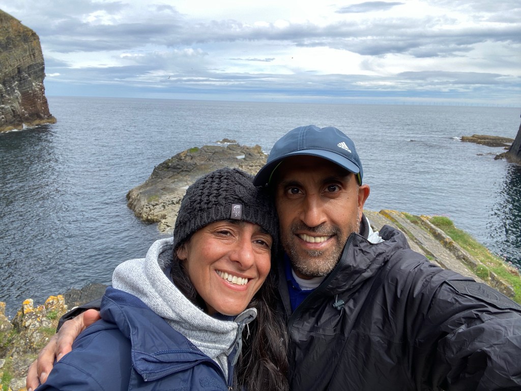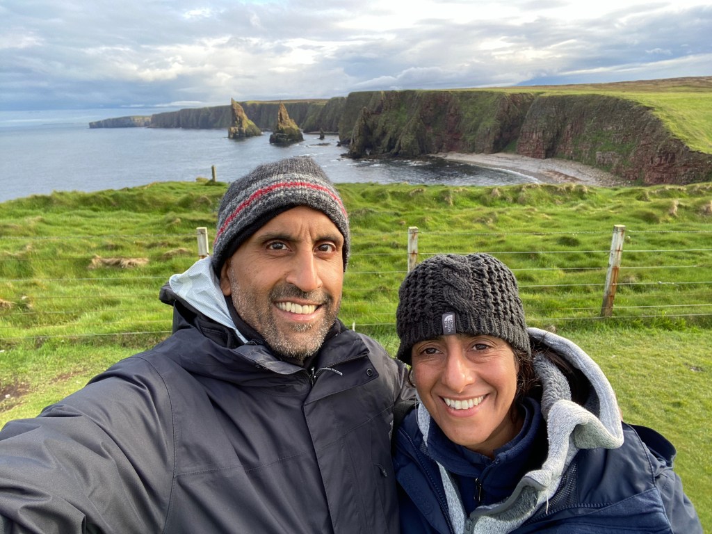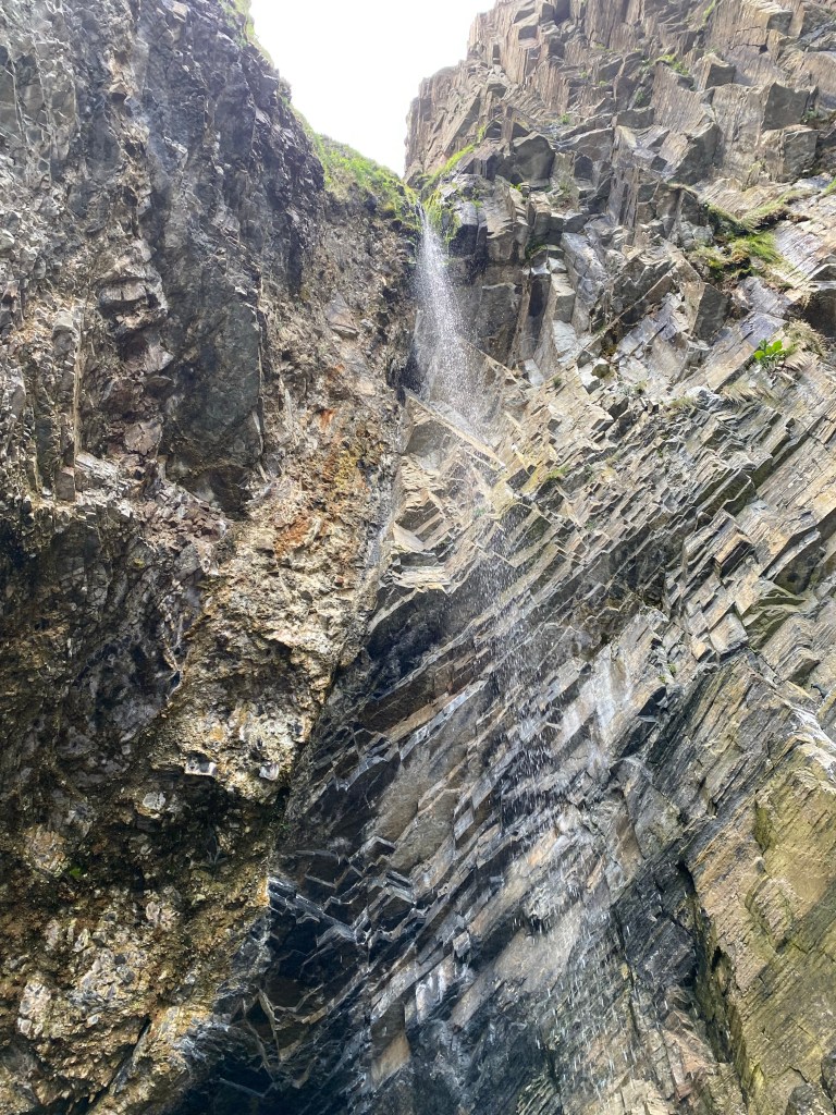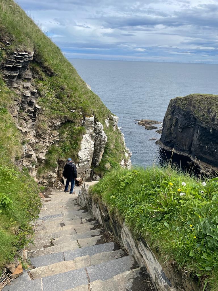 Such beautiful views on the route, and before long we see a sign for the Glenmorangie distillery. We drove through the gate but something didn’t feel right, it was so quiet, not a sole in sight…except a sign…Distillery Closed. Of course, it’s a Sunday (sorry Kris, no distillery edition). Back on the A9 and on to Wick. As per usual, Nisha had a stop planned, an hour and a bit later we took a sharp right onto a narrow and short road, cars and motor homes took up the 10 parking spaces but there were two empty at the far end. While Nisha put her warm layers on, I just put on my walking boots and windproof jacket. Off we set to follow signs for ‘steps’. Yep steps, named Whaligoe Steps…we walked down the steep steps and were met with breathtaking views…