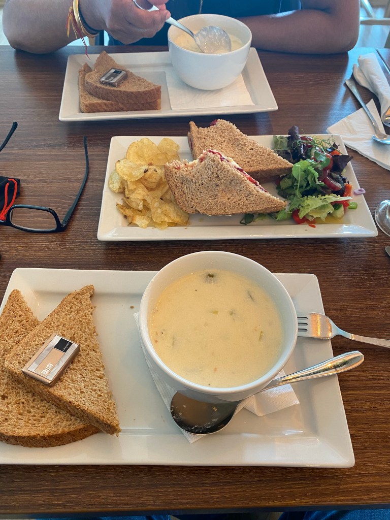 Nisha and I both order Cullen skink soup and a Brie and cranberry sandwich to share. Oat milk decaf latte for drinks. When the food arrives, it’s piping hot!!! We tuck in, it’s not bad, the soup could do with more fish and less potato, the sandwich is nice as is the latte. Dessert was a vegan and gluten free orange chocolate tart…very sticky…Rating 8 / 10.