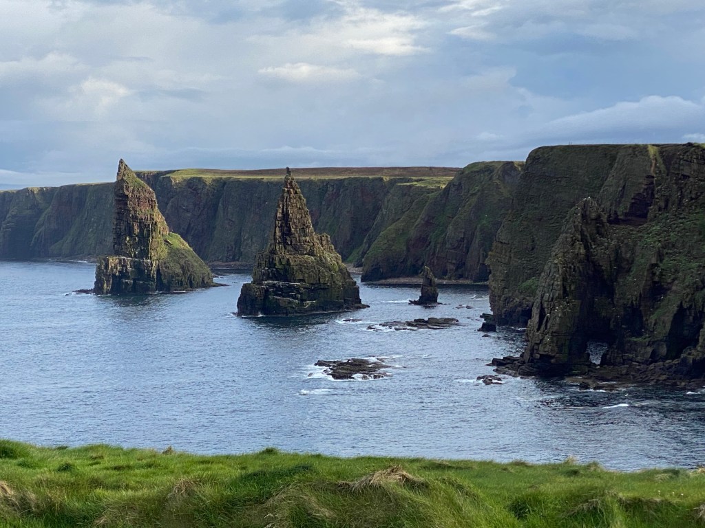 Back at the harbour, and with the captain’s permission, we disembarked, headed to their hut to return their life jackets and water proof macs. At the car, we took our layers off and programmed the sat nav to take us to Duncansby Stacks!!! 30 minutes later we pulled into a near empty car park, was this the place?? There was a lighthouse and exquisite views but no stacks. Yes yes, you want me to tell you what stacks are…well, let me show you…